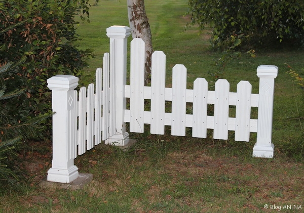 Nach der Montage vor Ort habe ich unter die Zaunfelder größere Feldsteine gelegt, die gleichzeitig eine gewisse Erdaufschüttung ermöglichen. Vor die Zaunfelder legte ich kleinere Steine in einem Halbkreis, so wie es auf dem Bild zu sehen ist.