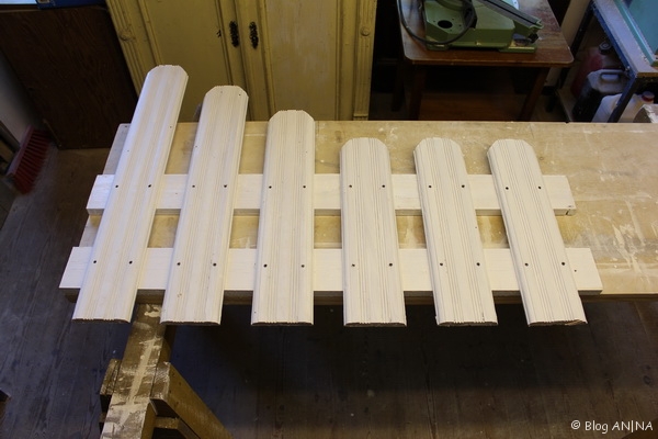 Der Zaunbau selbst ist eine relativ einfache Sache. Bevor ich die Zaunlatten (Bretter), die aus alten Türbekleidungen zugeschnitzten wurden, bearbeitete, habe ich die Pfosten mit Sandpapier angeschliffen und dann zweimal mit Acrylfarbe gestrichen. Die Zaunbretter musste ich zunächst von der alten Farbe befreien – hierzu eignet sich eine Warmluftpistole und ein scharfer Spachtel sehr gut – dann wurden sie auf Länge geschitten, oben die Ecken abgeschrägt und ebenfalls mit weißer Farbe gestrichen. Bei diesen Außentemperaturen ist ein mehrmaliger Anstrich innerhalb weniger Stunden durchaus möglich.