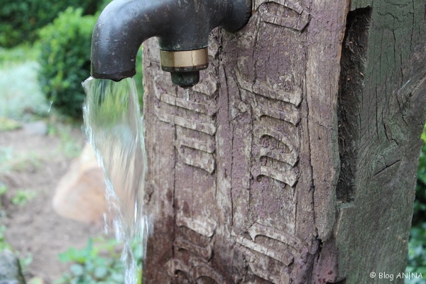 Ich hatte schon seit längerer Zeit einen alten Wasserhahn zu liegen, den ich einmal repariert hatte. Eigentlich wollte ich diesen Wasserhahn an einen großen Feldstein anbringen und das Teichwasser von meinem Schwimmteich durchlaufen lassen. Für den Stein am Teich habe ich eine andere Lösung gefunden und somit hatte ich erstmal keine weiter Verwendung. Letzte Woche sah ich dann auf meinem Lagerplatz einen kurzen Schriftbalken, der kaum noch irgendwo einzubauen war. Einen alten, sehr mitgenommenen Sandsteintrog hatte ich auch noch zu liegen und schon war die Idee von einen Brunnenbau in meinem Kopf.