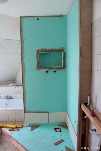Die nächsten Arbeiten werden das Belegen des Podestes und die Montage der Mischbatterie sowie der Duschabtrennung sein. Vorher muss aber noch die Decke für den Einbau der Strahler (Leuchten) um einige Zentimeter tiefer gelegt werden…