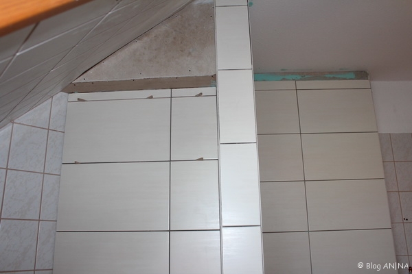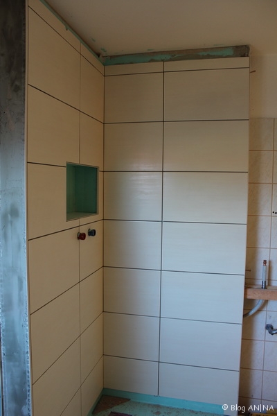 Nach dem durchtrocknen der Dichtungsmasse wurden die Fliesen an die Wand gebracht. Der Fliesenleger hatte hier viel mit zuschneiden zu tun. Eine relativ kleine Ecke und dazu noch mit Duschnische, beinhaltet schon viel Fummelei. Trotzdem hat er eine saubere Arbeit abgeliefert. Jetzt muss er nur noch die Siliconfugen ziehen.